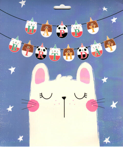 Happy Birthday macis zászlófűzér Happy Birthday macis zászlófűzér. A betűkön különböző macik vannak, úgymint panda, barnamedve vagy jegesmaci. Mind az ünnepre készülnek, mosolyogva tartják a betűket. Anyaga: karton Mérete: a mackók mérete 16cm x 19cm