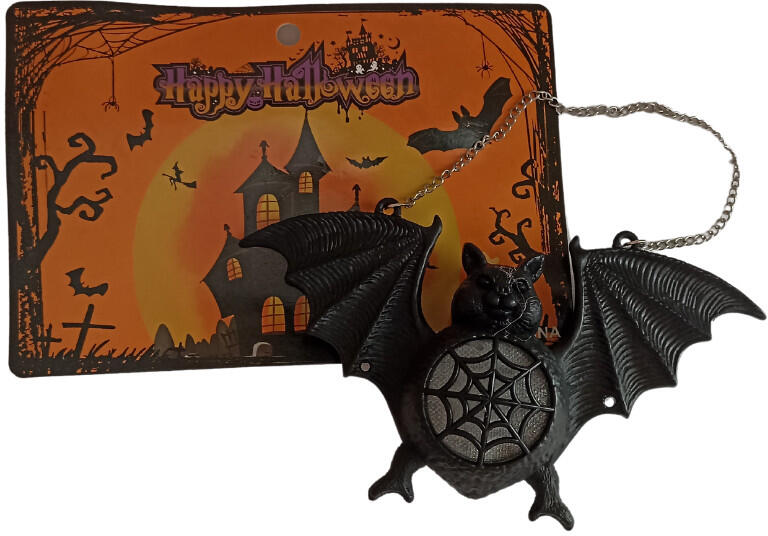 Műanyag denevér - halloweeni dekoráció Színesen világító pocakkal Műanyag denevér alakú halloweeni beltéri dekoráció Színesen világító LED fényforrással - mely 3db LR44 típusú elemmel működik - mellékelve Mérete: 25*11*4 cm