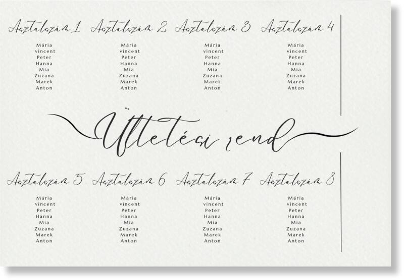 Az ültetési rendnek köszönhetően vendégei könnyen megtalálják a helyüket. Szervezeti struktúrát alakít ki az esküvői fogadás során a vendégek elrendezésére. Segítségével az egész nap menete egy játékká válik. Ülőhely-elrendezésünk harmóniát és békét hoz az esküvő napjára, lehetővé téve, hogy teljes mértékben élvezze a szeretteivel töltött pillanatok