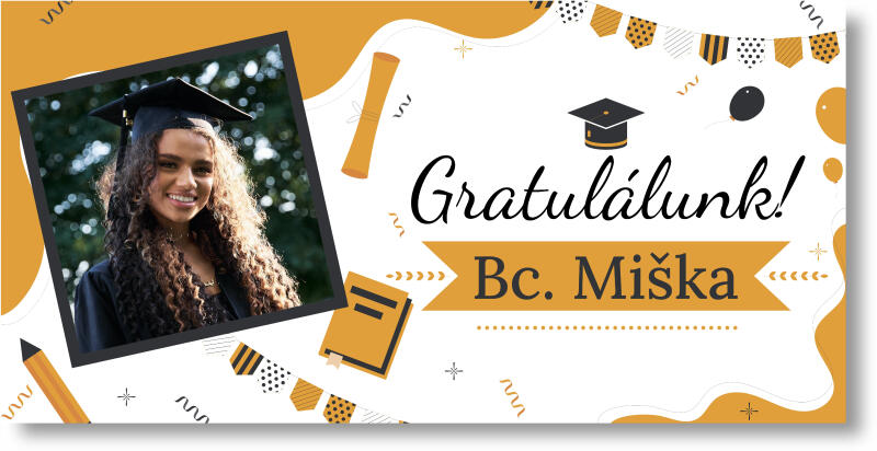 A bannerek diplomaosztóra lehetőséget adnak arra, hogy bármilyen ünnepséget személyessé tegyenek. Válassza ki a saját fotóját az ünnepelt személyről, adjon hozzá egy nevet, és kezdődhet az ünneplés! Ilyen módon egyedülálló és felejthetetlen pillanatot teremthet, amely mindenkinek örömet okoz. A banner könnyű és könnyen felakasztható. A narancssárga árnyalatok vid