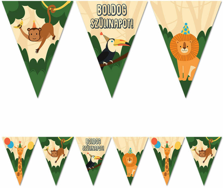 Dzsungel állatai elnevezésű, állatos mintás zászlófüzér szülinapi dekorációhoz, két oldalon nyomva, négy különböző állattal. A szülinapi zászlófüzér Hangulatfokozó: Ez a szépen elkészített, igényes kivitelezésű szülinapi zászlófüzér vidám és felfokozott hangulatot teremt, amely garantáltan hozzájárul a születésnapi partin való jókedvhez. Kreatív: A dzs