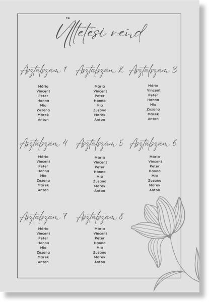 Az ültetési rendnek köszönhetően vendégei könnyen megtalálják a helyüket. Szervezeti struktúrát alakít ki az esküvői fogadás során a vendégek elrendezésére. Segítségével az egész nap menete egy játékká válik. Ülőhely-elrendezésünk harmóniát és békét hoz az esküvő napjára, lehetővé téve, hogy teljes mértékben élvezze a szeretteivel töltött pillanatok