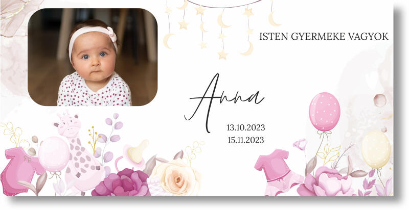 A keresztelői banner segítségével bármilyen ünnepséget személyessé varázsolhat. Válassza ki a saját fotót a babáról, addja hozzá a nevet, születési dátumot és a keresztelés dátumát és kezdődhet az ünneplés! Ily módon olyan egyedi és felejthetetlen pillanatot teremthet, amely minden jelenlévőnek tetszeni fog. A banner könnyű és könnyen felakasztható. A kifejező