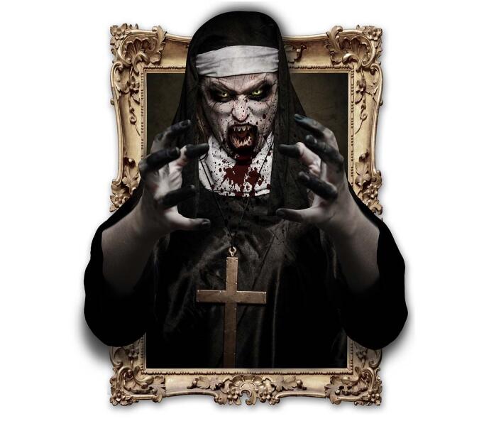 Fali dekoráció - Zombie apáca Kísérteties Halloween partit tervez? Teremtsen felejthetetlen Halloween hangulatot különféle kísérteties dekorációkkal , mint például ez a Zombie apáca motívumú fali dekoráció . anyag : PVC méret : 70 x 80 cm