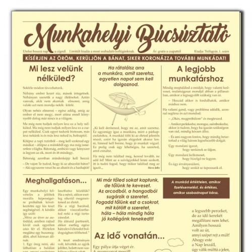 Vicces munkahelyi búcsúztató újság Búcsúzz el jókedvűen ezzel a búcsúztató újsággal kilépő kollégádtól. Mérete: 32 cm x 49 cm Oldalak száma: 4 Szín: fehér