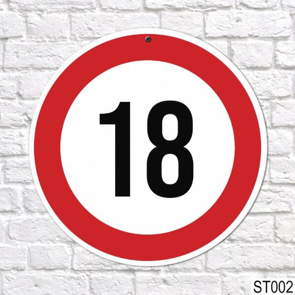 18-as sebességkorlátozó tábla 40 cm – 18. Szülinapi ajándék ötletek Kresz tábla szülinapraSzületésnapra Sebességkorlátozó táblák, ajándék ötletek szülinapra férfiaknak és nőknek. A Sebességkorlátozó tábla mérete 40 cm átmérőjű kör. Az elején és a hátoldalán is ugyan az a minta van. A tábla felső részén lyuk található, mellyel falra is akasztható. Term
