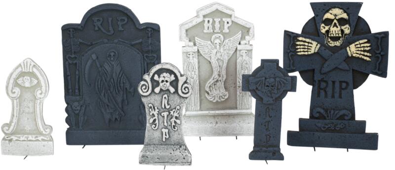 Six-piece gravestone set The gravestone set from Europalms is the perfect addition to your Halloween decoration: Whether in your living rooms decorated with spider webs or placed outside. It consists of six Styrofoam gravestone pieces in different colors, shapes and sizes. Outside, the gravestones can be easily arranged - with the help of earth spikes - in lawns to form a cemetery. This can then b