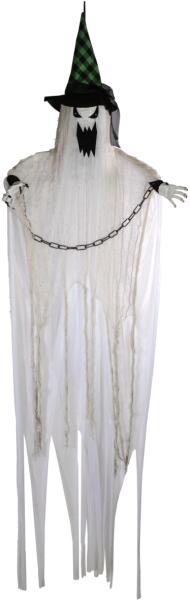 Animated ghost figure with pointed hat for your Halloween decoration The diabolically grinning hanging ghost figurine is the ideal addition to your spooky decorations. With maniacal laughter and flashing red LED eyes, the hanging ghost from Europalms will greet guests at your Halloween or theme party. He is so angry that his whole body vibrates, but luckily his scrawny hands are placed in medieval