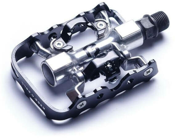 Korszerűen alakított kettős funkciós pedál. Egyik oldalon taposópedál, másikon SPD rendszer. Öntött alu test, Cr-Mo tengely. Méret: 99.5 x 96 mm. súly: 285 g. Ipari csapágyas.