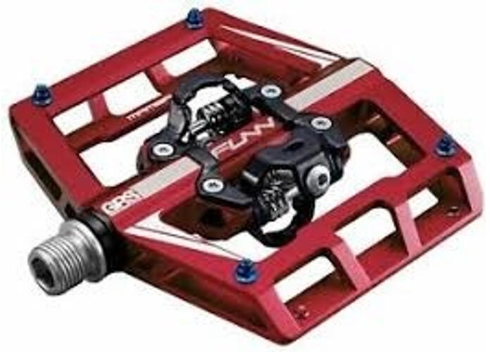 Funn Mamba ipari csapágyas egyoldalas MTB patentpedál, keretes, cserélhető szegecsekkel, piros Ez a verzió egy nagy keretes SPD / taposó pedál. Aszimmetrikus, tehát egyik oldalon SPD-s, a másik oldal taposó A Funn Mamba pedál egy igazi all-rounder, ami tökéletes DH, Enduro, Trail bringázáshoz. Az SPD-s oldalon 4 cserélhető tüske Taposós oldalon 11 cserélhető tüske GRS zsírz
