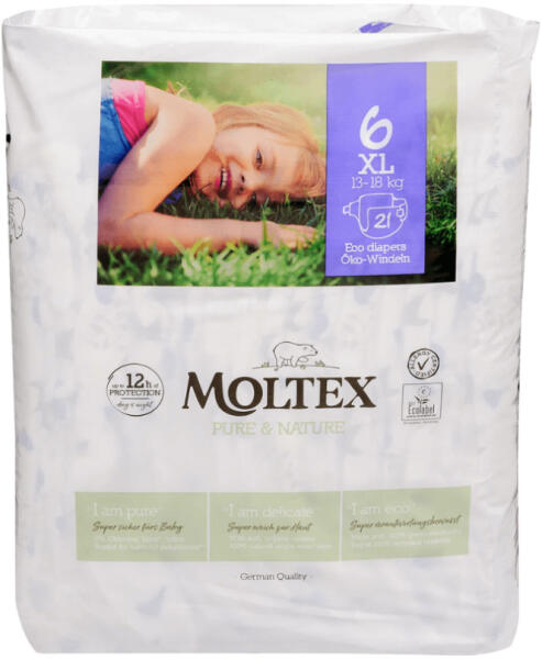 MOLTEX Pure&Nature öko pelenka, XL 6, 16-18 kg, 21 db Megújult külső, még kiválóbb minőség, még inkább környezetbarát! 100%-ban természetes, növényi eredetű összetevők használata a bőrrel közvetlenül érintkező, belső réteg esetében. Teljesen klór, illatanyag, latex és egyéb hatóanyagoktól mentes. Termékinformációk: - 100%-ban természetes, növényi eredetű