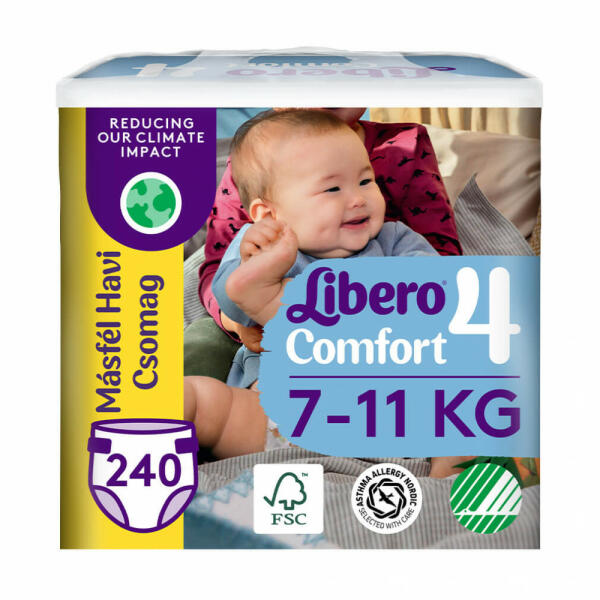 Libero Comfort 4 pelenka, 7-11 kg, MÁSFÉL HAVI PELEKACSOMAG 240 db A Comfort nadrágpelenka puha, teljes egészében légáteresztő, belső védőrétege hatékonyan felszívja a nedvességet. Rugalmas oldala, derékrésze és combgumírozása gyengéden körülfogja a baba pocakját és combját így minden mozdulatnál tökéletesen illeszkedik a test vonalához, éjjel-nappal kényelmes vise