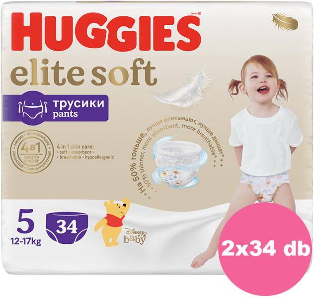 A csomag tartalma: Huggies Elite Soft Pants 5-ös bugyipelenka 12-17kg, 2x34 (68) db Puhaság és kényelem : A Huggies Elite Soft Pants kiváló minőségű anyagokból készülnek, amelyek rendkívül puha és kényelmes viseletet biztosítanak a baba számára egész nap. Kifinomult nedvszívó képesség : A bugyipelenka speciális kialakítása lehetővé teszi, hogy hatékonyan elnyelje a ne