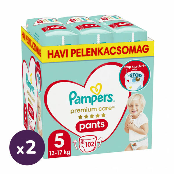 Pampers Premium Care Pants bugyipelenka 5, 12-17 kg HAVI PELENKACSOMAG 204 db Búcsút inthetünk a macerás peluscseréknek a legújabb pelussal, a Pampers Premium Care Pants bugyipelenkákkal. Babócánk derekát körbeölelő gumírozásának köszönhetően könnyen felhúzható, még akkor is, hogyha a gyermek izeg-mozog. Ugyanilyen gyorsan pedig le is tudjuk róla venni, egyszerűen csak fel