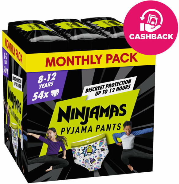 Bemutatjuk… a Ninjamas Pants pizsamapelenkát! Álljon ellen az éjszakai baleseteknek, hogy gyermekének magabiztosan induljon a napja a kiszivárgás elleni védelemmel egész éjjel. A Ninjamas pelenkanadrág az Instant Absorption technológiának köszönhetően azonnal elnyeli a nedvességet, így példátlanul hatékony védelmet biztosít. A FormFit kényelmes derékrészének köszönhet