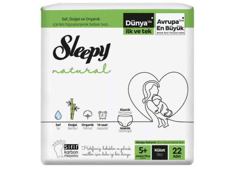 Sleepy Natural Ultra Sensitive Bambusz bugyipelenka Junior+ 5+ (13-20kg) 22db A bambuszrost tartalmú Sensitive pelenka kiválóan alkalmas érzékeny bőrű babák számára. Természetes bambuszt, tiszta vizet és természetes pamutot tartalmaz. Nem tartalmaz alkoholt, nylont, illat és színezékmentes. Hypoallergén Nedvességjelző csík jelzi az esedékes cserét. Rugalmas derékrész biztos