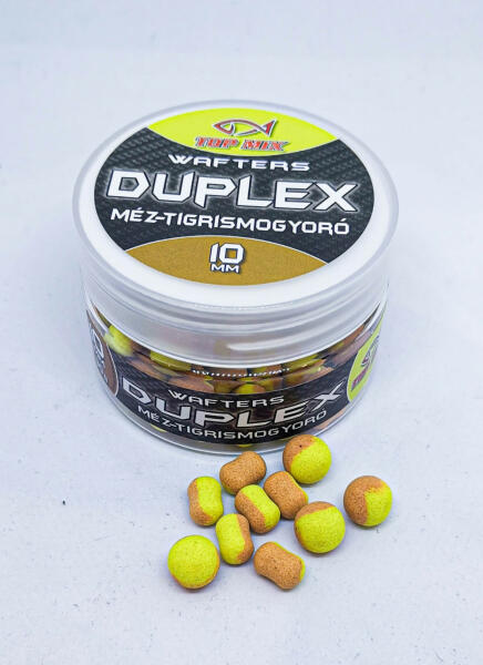 A Top Mix Duplex wafters termékcsalád tagjai azoknak a feeder horgászoknak készültek, akik szeretik az attraktív oldódó csalikat. Kikönnyített pelletek, de épp csak annyira, hogy fine tüske mellett #14 horgokkal is használhatók legyenek a legkisebb, 8-as méretek. 8mm, 10mm és 12mm méretekben kapható minden íz. Oldódási képessége intenzív, "nyitott csali", hogy az aroma mell