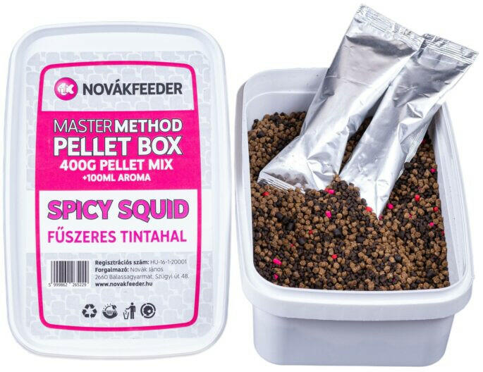 A Novákfeeder Master Method Boxban halas, tehát fehérjedús és szénhidrátban gazdag pelletek speciális keveréke található, a 400g pellet keverék horgászathoz való előkészítéséhez szükséges 100ml aroma mennyiséggel. Az aroma tasakot kibontva, annak tartalmát rá kell önteni a pelletre, majd jól összerázni és 10-15 percet állni hagyni. A keverék ezután használható, ko
