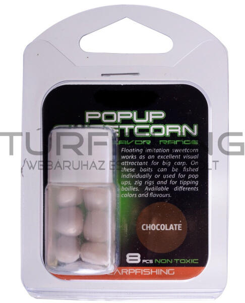 Extra lebegőképességű kukorica imitáció, nagy töménységű aromafolyadékkal. Feltűnő színével magára vonja a nagy pontyok figyelmét. A nagy töménységű aroma tovább fokozza a hatást. Önmagában illetve más csalikkal kombinálva is használható. Szín: Fehér Íz: Csokoládé Kiszerelés: 8 db / üveg