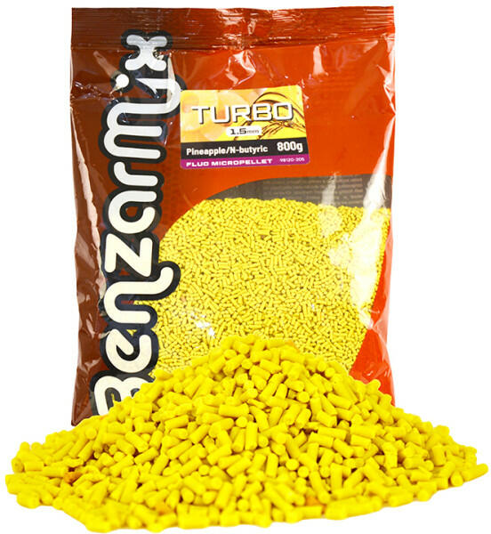 Benzár Mix Fluo Turbo Pellet Ananász- vajsav 1,5mm 800g Élénk fluo színek Magas szénhidrát tartalom Modern ízesítés Egy rendkívül kedvező árú pelletről van szó, ami sokféle szituációban lehet megfelelő alternatíva a horgászok számára, hiszen egy sokkal élénkebb, fluo színnel rendelkeznek . Ez a pellet magas szénhidrát tartalommal rendelkezik , hiszen a fő alkotóelem