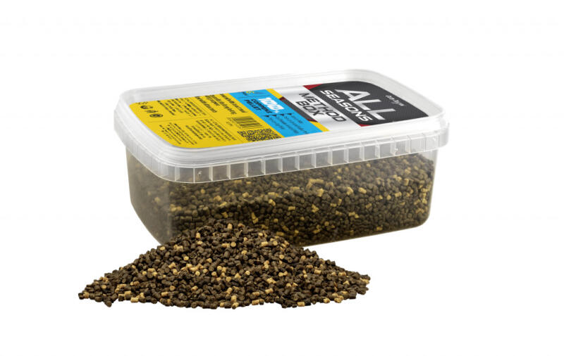 Az All Season Method Box összetételének kialakítása során nagy hangsúlyt fektettünk arra, hogy magas minőségű pelletek kerüljenek a dobozba. A keverékbe ezért a holland Coppens cég prémium minőségű pelletei kerültek. Míg az 1,5 milliméter szemcseméretű Intensiv pellet a vízbe érkezés után szinte azonnal kifejti csalogató hatását, addig a Premium Selected Halibut és