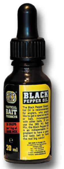 SBS Black Pepper Oil , azaz Fekete bors olaj. Régi megfigyeléseken alapszik, hogy a pontyok imádják az erősen fűszeres ízeket. A fekete bors esszenciális olaj olyan horgászok számára ajánlott, akik egyedi, semmihez sem hasonlítható csalit, etetőanyagot szeretnének kézhez kapni. Az adagolásával viszont nagyon óvatosan kell bánni, mert ez a termék az átlagosnál is töményebb