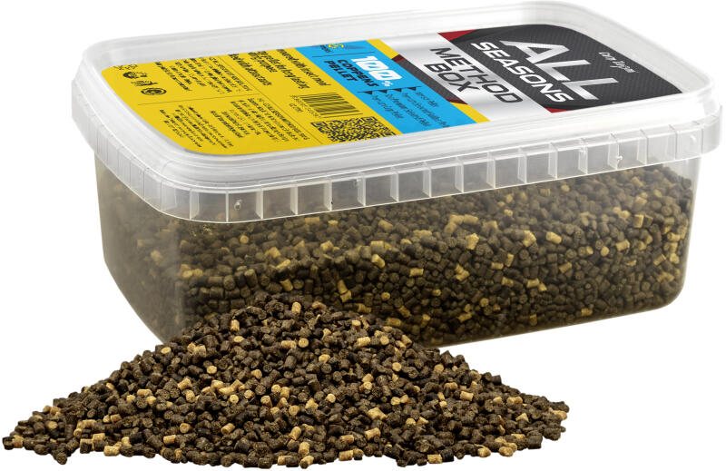 Az All Season Method Box összetételének kialakítása során nagy hangsúlyt fektettünk arra, hogy magas minőségű pelletek kerüljenek a dobozba. A keverékbe ezért a holland Coppens cég prémium minőségű pelletei kerültek. Míg az 1,5 milliméter szemcseméretű Intensiv pellet a vízbe érkezés után szinte azonnal kifejti csalogató hatását, addig a Premium Selected Halibut és