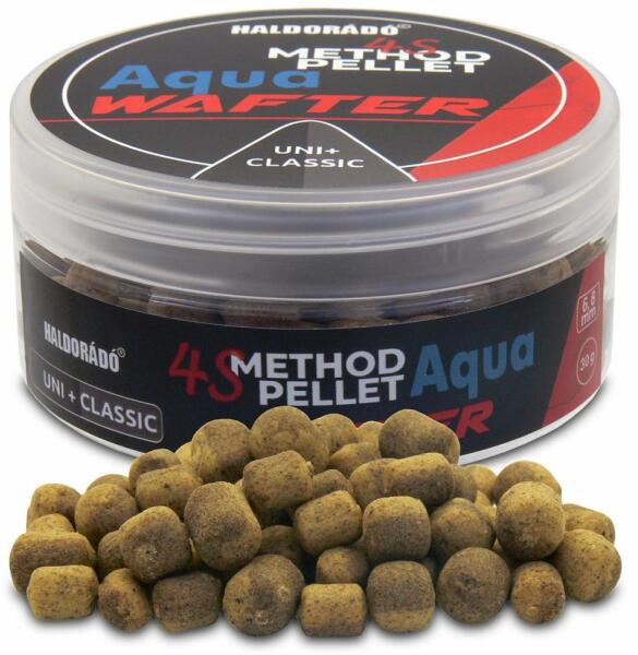 A 4S Method Pellet Aqua Wafter termékcsalád három tagból áll. Elérhető Uni, Classic, valamint az Uni + Classic változatokban. Nem nehéz kitalálni, hogy a név jelzi azt, melyik pelletfajta őrleményéből is áll a csali. A legérdekesebb az Uni + Classic, mely a két legnépszerűbb pellet 50-50%-os keveréke. Az Uni változat sötétbarna, inkább már fekete, a Classic változat vil