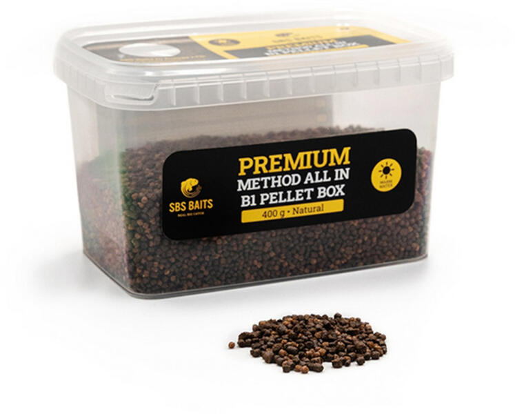 Sbs Premium Method B1 Natural 2-4mm Pellet Box 400gr A doboz 4 különböző típusú, 2-4 mm-es pelletet tartalmaz, amelyek ideálisak method feeder horgászathoz A pelleteket 150 ml folyadékkal kell bekeverni. Javasolt keverési arány: 50 ml Method Feeder Liquid (a doboz ezt nem tartalmazza) és 100 ml víz. Ezt jól rázzuk össze, majd öntsük a pelletekre A method feederes pontyhorgászat