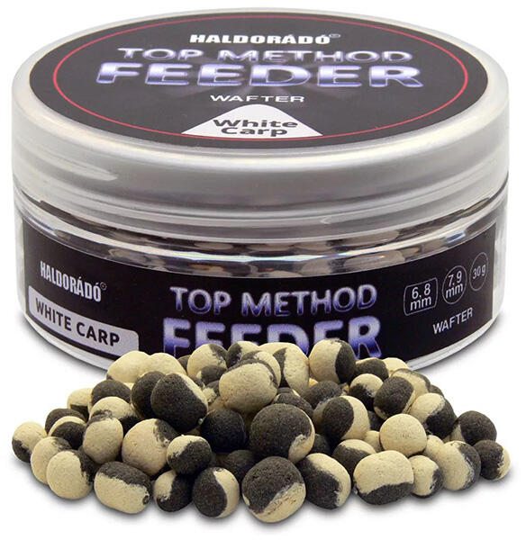 A Top Method Feeder Wafter csalik mérsékelt felhajtóerővel rendelkeznek és méretben is passzolnak a legnépszerűbb method horgokhoz és csalitüskékhez. A White Carp vanília és finom fűszerek elegyének ízét kapta, színe pedig sötétbarna + fehér. 6 és 8 mm-es dumbell, valamint 7 és 9 mm-es golyó formájában található meg a csomagolásában.