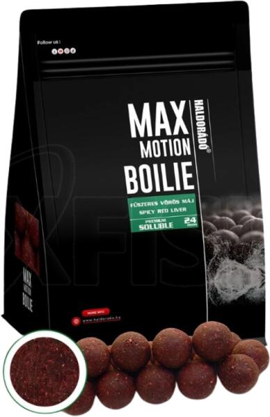 Fűszeres vörös máj- Halas, fehérjedús változat (piros) A MAX MOTION Boilie Premium Soluble 24 mm golyók a víz hőfokától függően kb. 1,5-3 óra alatt oldódnak fel. Oldódás közben intenzív íz és aroma kibocsájtás történik. Elsősorban a terep előkészítésére, előetetésére szolgálnak, anélkül, hogy eltelnének tőle a halak, de amikor kényesen, óvatosan táplálko