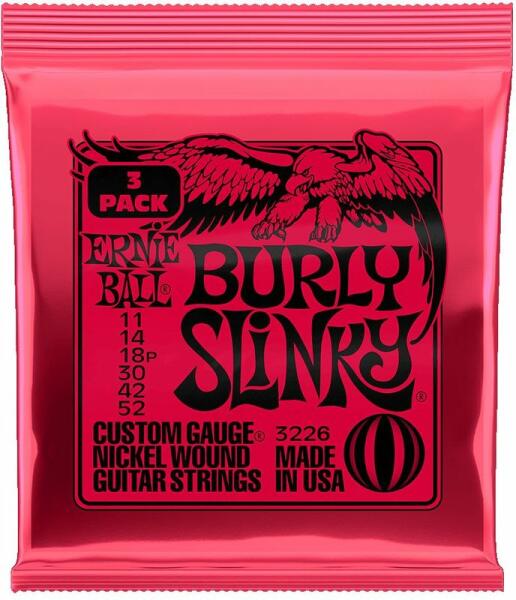 3 készlet nikkel bevonatú acél húr, 011-052 Három külön szettből álló csomag Vastagságok: . 011 . 014 . 018p . 030 . 042 . 052 Az Ernie Ball Burly Slinky húrok azoknak a zenészeknek lettek kitalálva akik kedvelik a Power és Skinny Top Heavy Bottom Slinky húrok kombinációját. Ezek a húrok a precíz gyártásnak köszönhetően tökéletes összetételűek, optimális játékérz