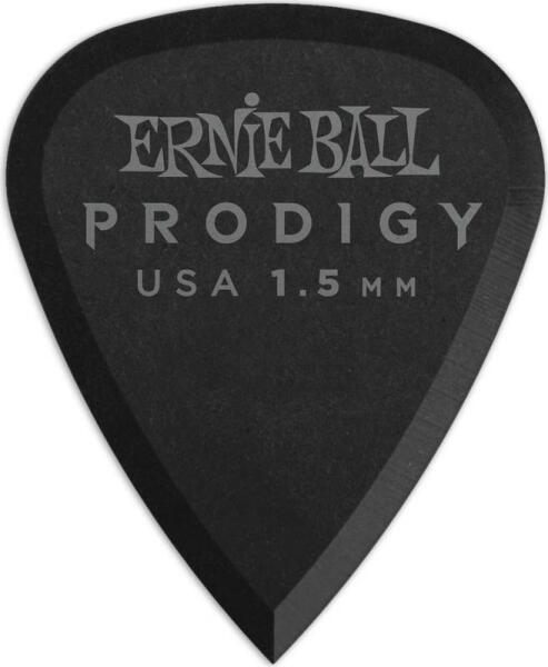 Gitárpengető, csúszásmentes Delrin anyag, 1,5mm vastagság, matt fekete Az Ernie Ball Prodigy pengetők rendkívül stabilan fekszenek a kézben, a csuszasmentes delrin anyaguknak köszönhetöen. A megmunkált él és a hegy könnyedebb pengetést tesz lehetővé, emellett jobban artikulálhatóvá teszi a hangképzést és precízebb irányítást biztosít a húrokon. Matt fekete Delrin 1.5