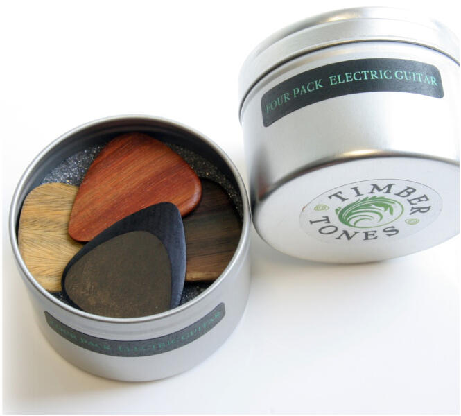 TIMBERTONES4 plectrums set in Lignum Vitae, African Ebony, Indian Chestnut & Bloodwood, ideal for electric guitar. Box in anodyzed metal. Make ...