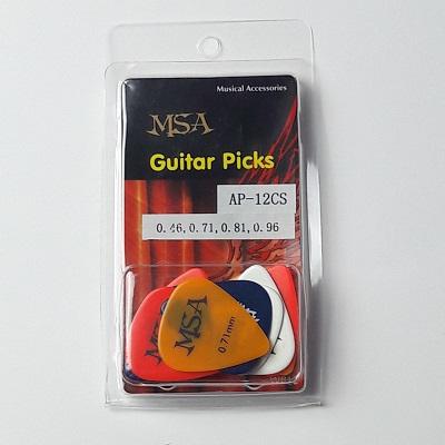 MSA AP-12CS 12 db-os, nylon alapanyagú pengető készlet 0.46/ 0.71/ 0.81/ 0.96/ vastagságban, több színben, nyitható-zárható praktikus csomagolásban. Ajándéknak is