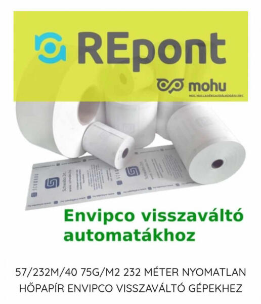 Hőpapír TOMRA visszaváltó automatákhoz. Szélesség: 58 mm Hossz: 450 fm (folyóméter) Tekercs átmérő: 190 mm Cséve átmérő: 25 mm Hőpapír: 58g BPA-mentes : Nem tartalmaz Biszfenol A-t, ami egészségügyi szempontból előnyös. Nyomatlan: Nincs rajta előre nyomtatott szöveg vagy minta. Felhasználási terület: TOMRA visszaváltó gépekhez való. Márka: Bluering® Ez a hőpapí
