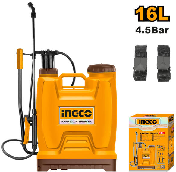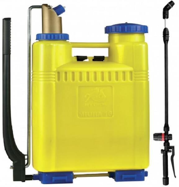 Literes skálával kialakított praktikus, kiváló műanyagból készült háti permetező. A tartály kapacitása 16 liter, maximális nyomás 3 bar. Dugattyús, nagy nyomáskiegyenlítő tartállyal ellátva az egyenletes permetezésért. A növényvédelem hatékony eszköze, mellyel bármilyen folyékony permetszer kiszórható, alkalmas kártevőirtásra és a növények betegségeinek megel