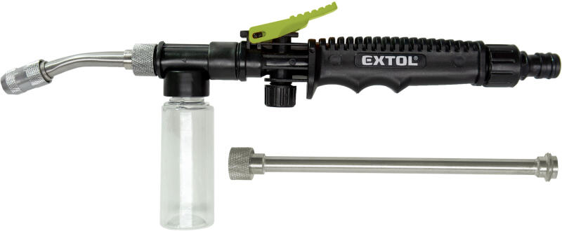 Kerti locsolótömlőhöz gyorscsatlakozóval csatlakoztatható, teljes hossz: 31 cm, toldóval 50 cm, fém szórófej állítható szórással, 50 ml mosószer tartály, rögzíthető kioldóbillentyű. Különböző felületek: járdák, teraszok, kerti bútorok, kerékpárok, autók stb. nyomás alatti tisztítására közvetlenül a vízvezetékről vagy a szivattyúról, továbbá kerti locso