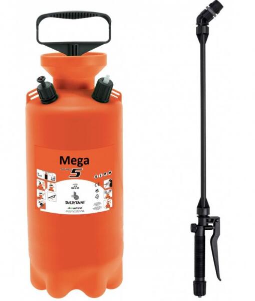 Permetezõ Olasz Dimartino Mega pumpás, vállra akasztható 5 literes permetezõgép. A permetezõ szóró szár a markolattal együtt 65 cm. A betöltõ nyilás átmérõje 10 cm. A permetezõgép és a permetezõszárat vászonbetétes ( 6,3 mm belsõ és 11,5 mm külsõ átmérõjű ) 120 cm hosszú tömlõvel van összekötve. A permetezõ akasztó pántja fekete vászon, melynek a szélless