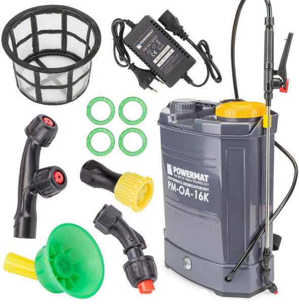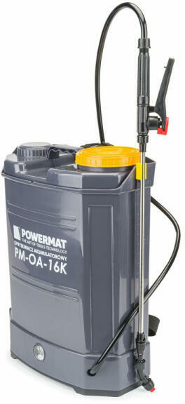 Műszaki adatok Tartály űrtartalma: 16l Tápellátás: újratölthető Üzemi nyomás: 1,5-4,5 [bar] Szivattyú típusa: membrán Tömlő hossza fogantyúval: 120 cm Maximális permetezési idő teljesen feltöltött állapotban: 8 óra Hatékonyság egyetlen fúvókán: 1,5-1,6 [l/perc] Teljesítmény a kettős fúvókán: 1,8-3 [l/perc] Akkumulátor típusa: ólom - kadmium Az akkumulátor né