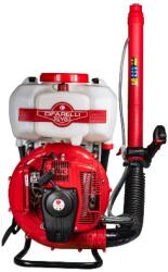 Robbanómotoros hátipermetező, motor: 77cm3, 2 ütemű, Teljesítmény: 5 LE, Vegyszertatály mérete: 12L, Szállított levegő mennyisége: 20m3/perc, Sebesség: 125m/sec, Folyadék szórásának szélessége: 17m, Folyadék szórásának magassága: 15m, Permetlé szállítás: 0-3.6 l/perc, Átlagos csepp méret 120 m, Öt fokozatú állítási lehetőség, üzemanyagtartály 1,9 liter, üre