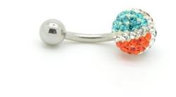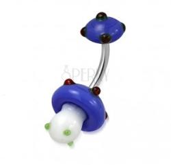 Sebészeti acél köldök piercing. Hajlított banán résszel, amely egyik végén egy akrill gomba fübb, sötétkék kalappal és fehér tönkkel. A másik végén sötétkék kalap helyezkedik el. A kalapokon apró barnás-zöld golyók találhatóak. A fehér tönkön négy halványzöld golyó van. Szélesség: 1,6 mmHossz: 9 mmKalap átmérője: 9 mmGomba mérete: 11 x 12 mmAz ár egy darab