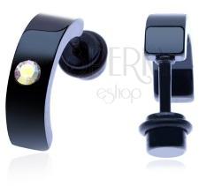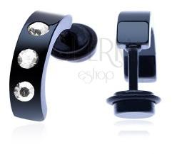 Acél hamis fültágító dugó, fekete színű plug fényes, sima felülettel. Az első részét egy félkör formájú sáv alkotja, melynek hosszán három kerek, tiszta cirkónia helyezkedik el. A hátsó részét egy henger fekete, vékony gumicskával alkotja. Szélesség: 1,2 mmHossz: 6 mmA piercing mérete: 4 x 13 mmAz ár egy darabra vonatkozik.