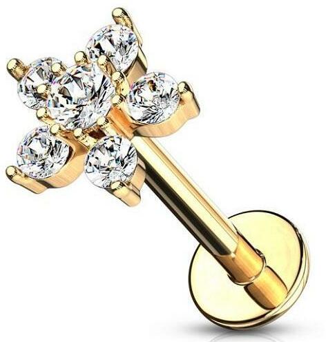 Hossz: 8 mm. Dísz mérete: 6,4 mm. Szín: AranyA kő színe: ÁtlátszóEgy aranyos, nőies labretre találtál, amit egy csodás kis kövekkel kirakott csillag forma díszít. Az ékszer orvosi acélból készült és belső menetes. Mivel ez egy nagyon sokoldalú ékszer, több helyen is hordhatod. A virág ármérője 6,4mm.