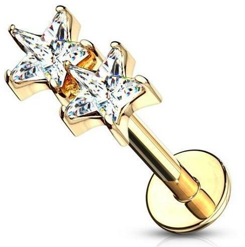 Hossz: 8 mm. Dísz mérete: 5.2 mm x 9.5Szín: AranyA kő színe: ÁtlátszóEz a labret belső menetes, ami kényelmes behelyezést tesz lehetővé. Egy belső menetes labretnél a menet a szár belsejében van, ebbe lehet belecsavarni a disszel ellátott felső részt. A szár, ami keresztül megy a bőrön, orvosi acélból készült, a csillagok pedig rézből vannak. A szár vastagsága 1.2 m
