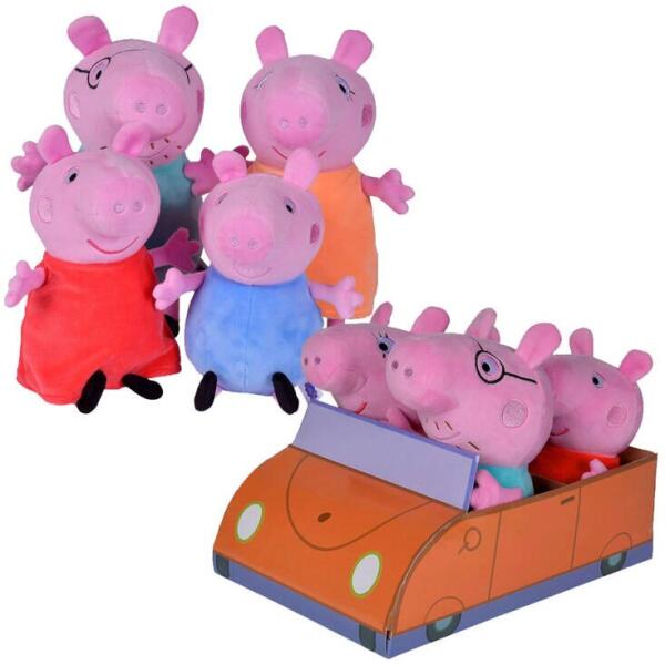 Peppa Malac plüssfigurák papír autóban Tökéletes készlet minden rajongó számára a vicces Peppa Pig kalandjainak, családjának és barátainak. A készlet négy kabalából áll: Malacpapa, Malacmama, Peppa Malac és természetesen a kis Zsoli. A sertéscsalád ezúttal egy piros autóval (színes kartonból készült járművel) indult útnak. A tágas autóban minden kismalac kényelme