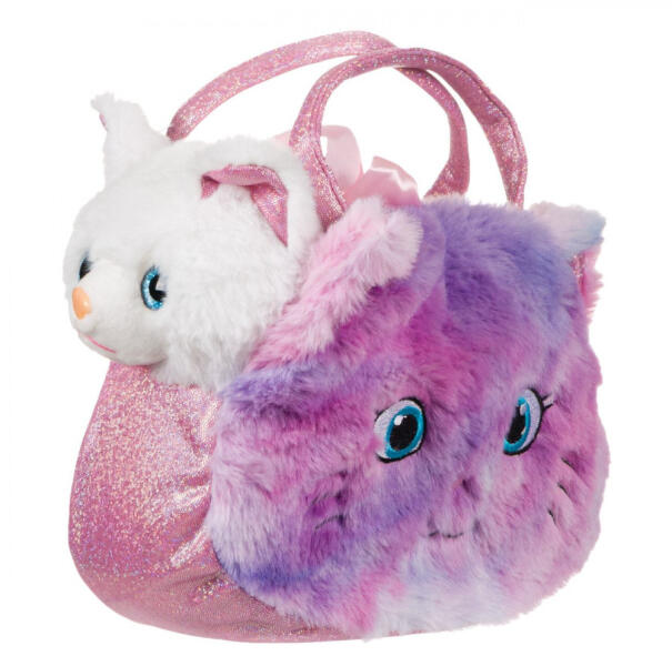 Puha fehér plüss cica lila táskában, csillogó fülekkel és szemekkel. Tedd bele a cicát a cicás táskába. Mérete: 20x8x22 cm