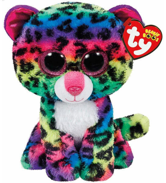 A puha tapintású Dotty leopárd plüssfigura minden gyerek kedvence! Szivárványos bundája és az übercuki gombszemei teszik különlegessé ezt az aranyos leopárdot! Gyűjtsd össze a többi Ty Beanie Boos plüsst és játszatok együtt a barátaiddal! A leopárd leírásából, amit a csomagban találtok megtudhatjátok Dotty születésnapját és egy verset is olvashattok. Mérete: 15 cm.