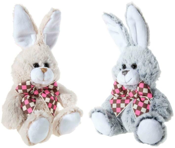 A puhán kitömött, ülő nyuszi pihe-puha szintetikus plüssből készült. A kockás masnival díszített nyuszi szürke és bézs színben kapható. Méret: 27 cm