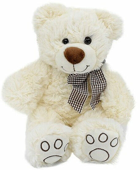Pihe-puha krémszínű plüss maci gombszemekkel, kockás szalaggal a nyakán. Mérete: 25 cm.